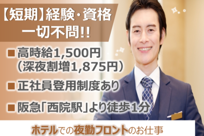 | 給与 | 時給1,600円~2,000円(交通費全額支給) ■深夜勤務割増2,000円 |